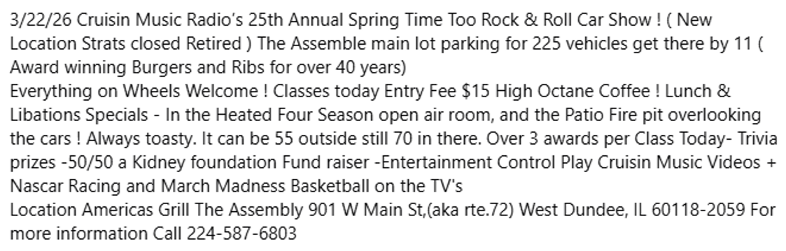 Hide Away 46 N. Addison St. Bensenville, IL. 10:30am